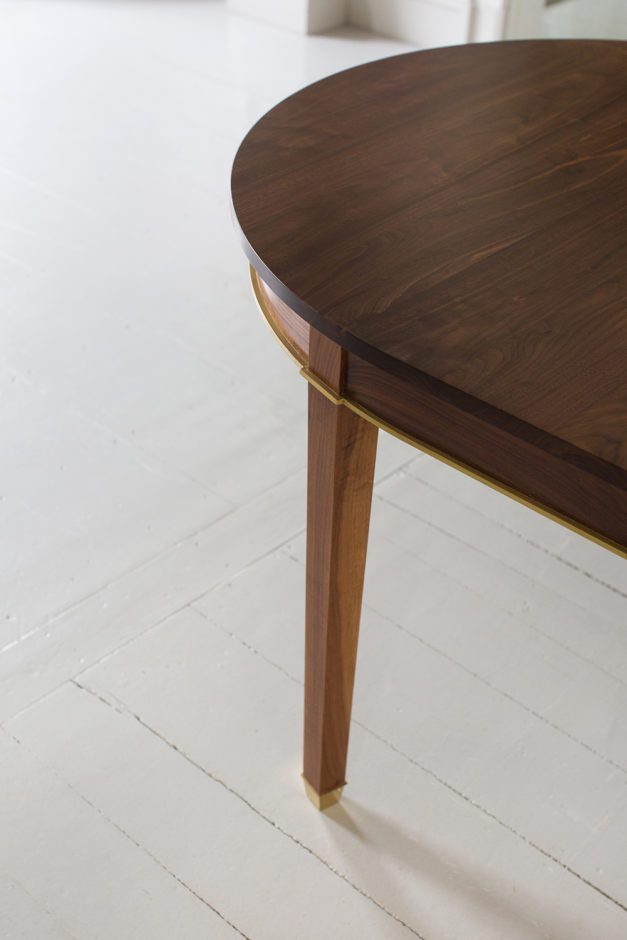 Made from carefully matched solid grain wood and utilizing solid brass elements and hand-painted details, the Lincoln Dining Table exemplifies the finest of Maine craftsmanship.