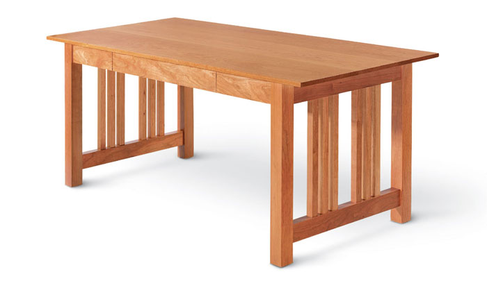 The Oxford Desk: a practical desk of strong stature with Arts & Crafts influences. The Oxford Desk includes a center pencil drawer or keyboard tray, and leather insert top. Optional without leather.